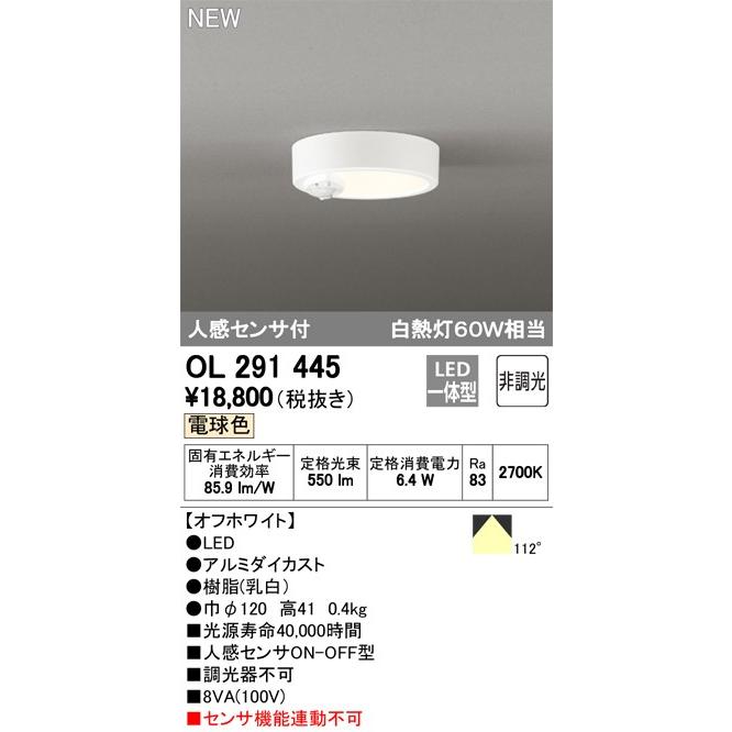オーデリック ledシーリングライト トイレ用 人感センサ付 白熱灯60w相当 電球色 ol291445 照明器具のcomfort 通販 paypayモール