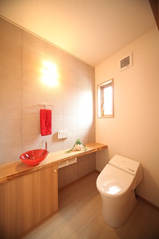 人と同空間に猫用トイレを設置し 流せる猫砂を使えばお手入れも楽々 使い勝手の良さを実現したシックなトイレ空間には エコカラットの壁を配し 湿