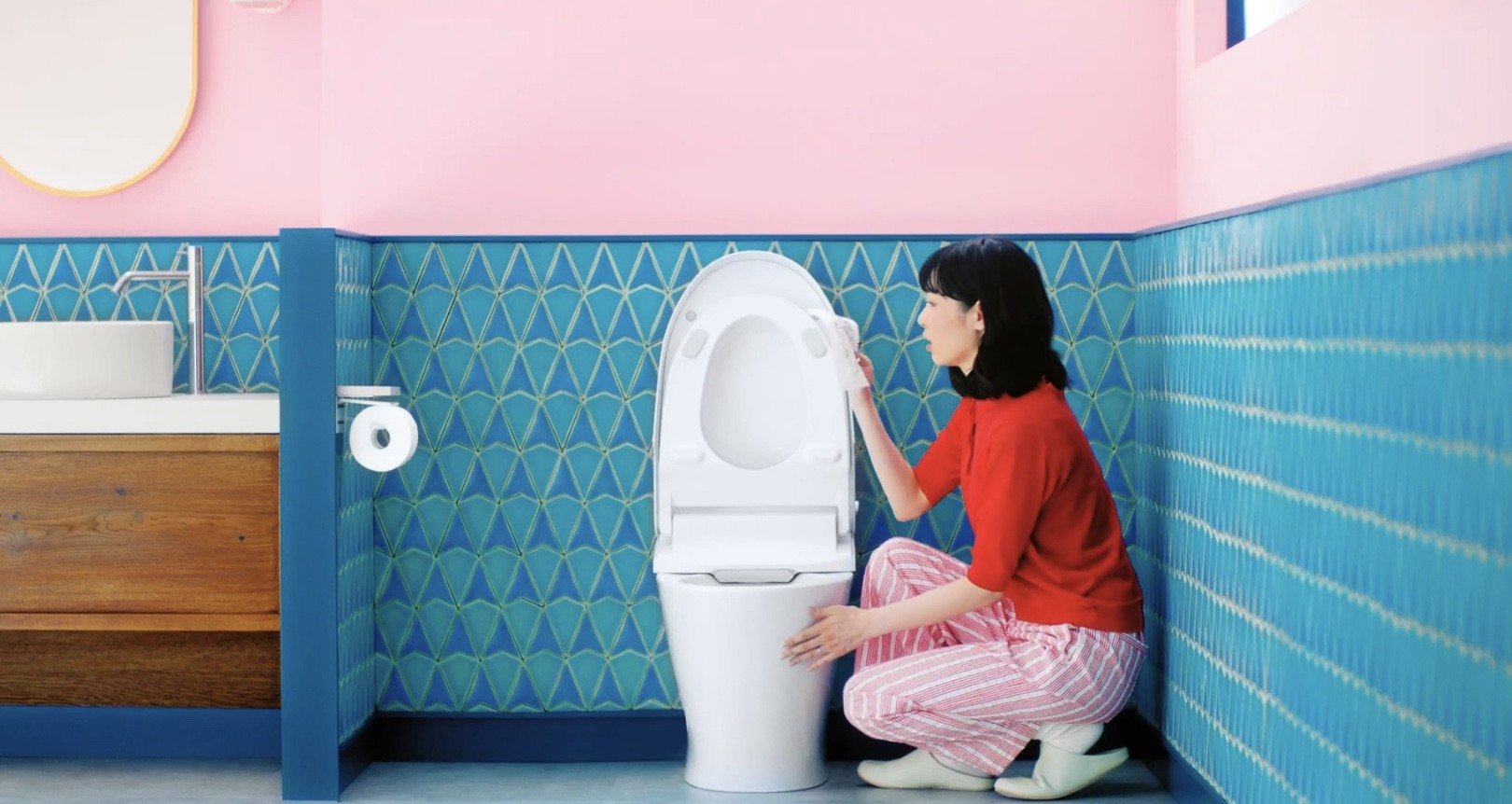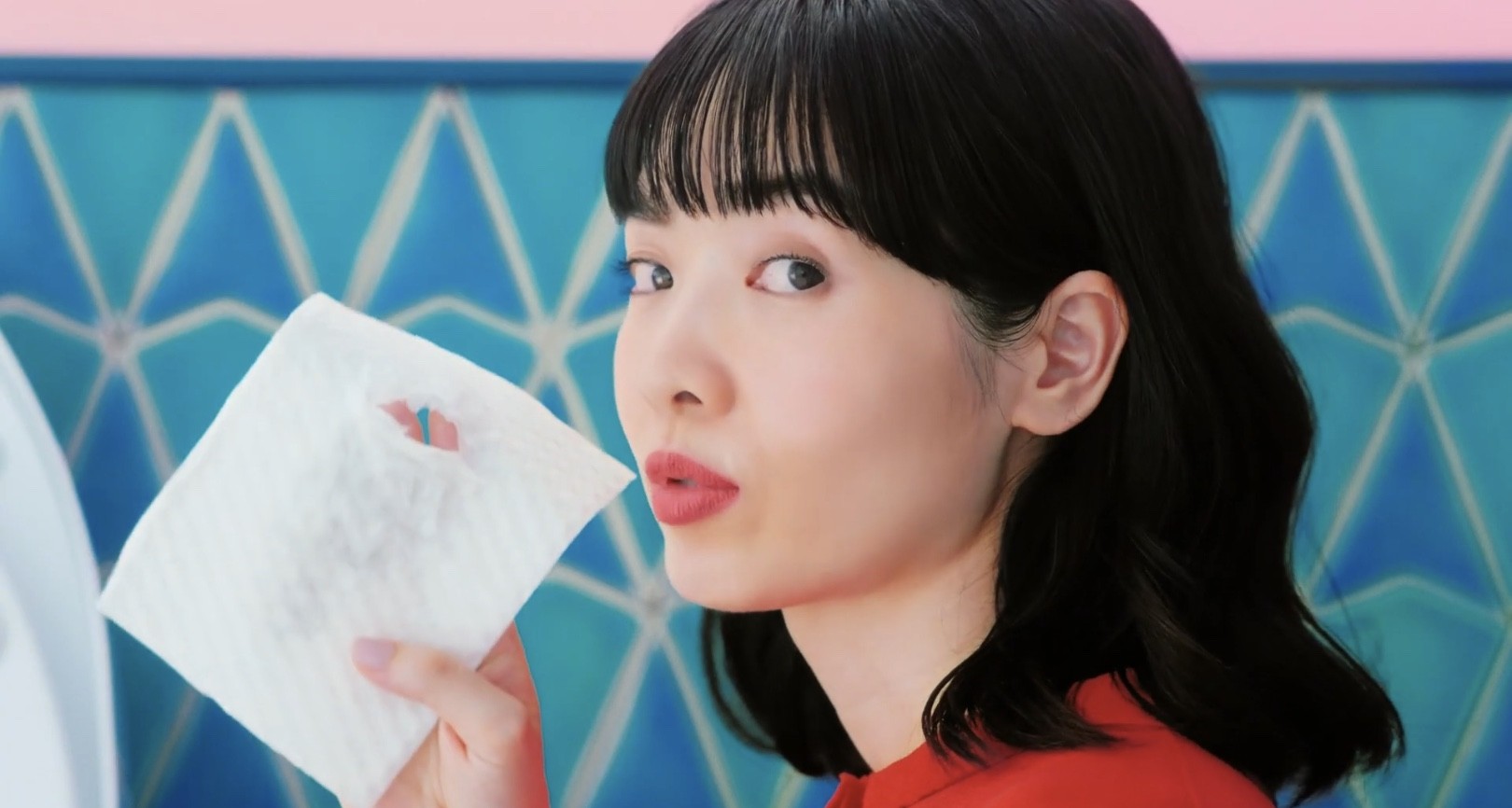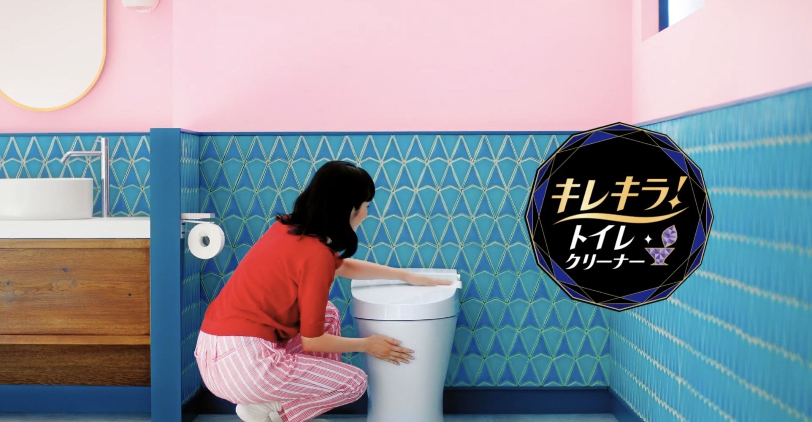 エリエールのトイレクリーナー キレキラ cmでトイレ掃除をする女性は権藤朱実 真っ赤な衣装と美しい黒髪がチャーミング