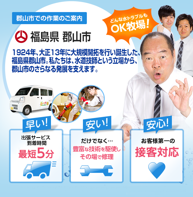 郡山市の水道屋 郡山 久保田 駅前地域の水漏れ修理 トイレ詰まりなら 水110番