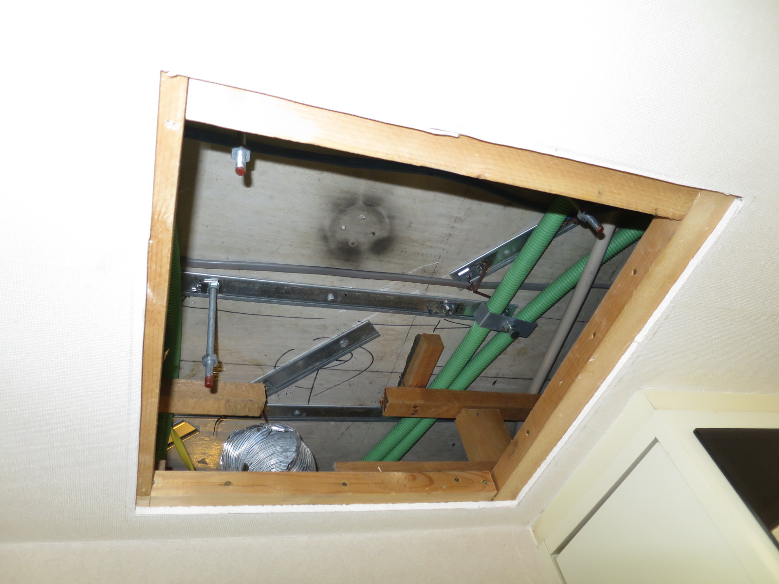 熊澤しゅんすけ は でんきやさんです twitter પર 天井裏からこんにちは 今日はスキマ時間で進行中のトイレ 増設工事の電気配線やらをしています 物入れをトイレにリフォームするので 照明 コンセント スイッチ 換気扇などを設置し電気配線 ええ 外は寒くても