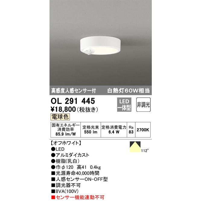 オーデリック ledシーリングライト トイレ用 人感センサ付 白熱灯60w相当 電球色 ol291445 照明器具のcomfort 通販 paypayモール