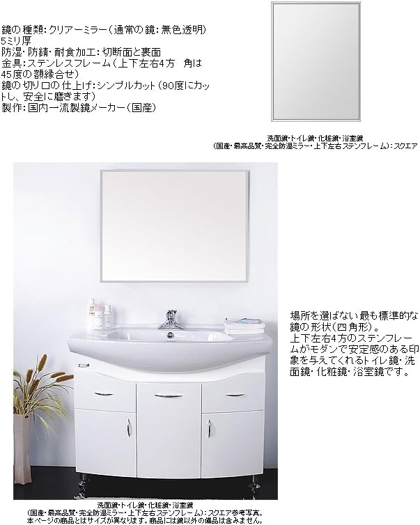 amazon 洗面鏡 トイレ鏡 化粧鏡 浴室鏡 国産 最高品質 完全防湿ミラー 上下左右ステンフレーム スクエア 浴室用化粧鏡
