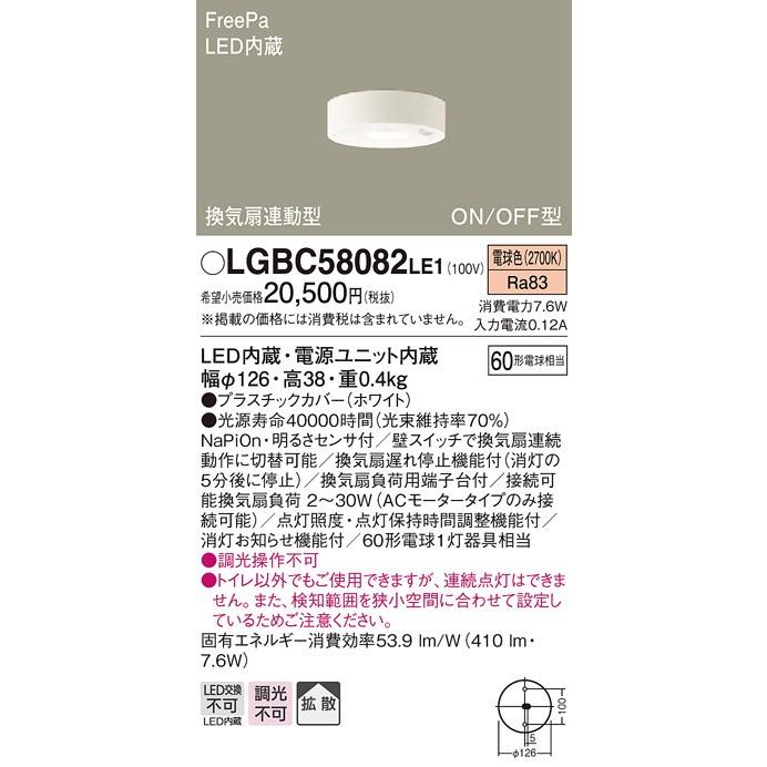 lgbc58082le1 パナソニック freepa 換気扇連動ledダウンシーリング トイレ用 on off型 7 2w 電球色 タロトデンキ 電設資材店