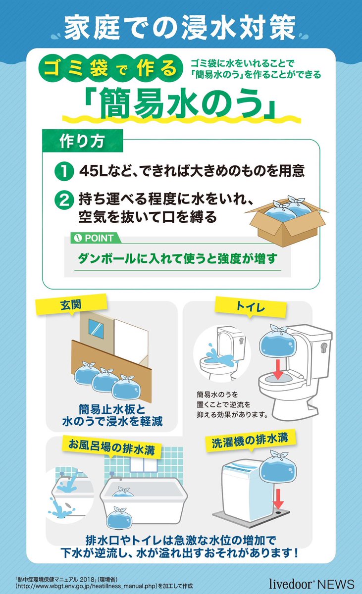 ほし on twitter マンションやアパートの一階に住んでる人へ 冠水に備えて今すぐトイレに水の入ったビニール袋を入れましょう 冠水すると 排水や汚水が逆流する可能性があります 避難する人はこれをしてから避難しましょう