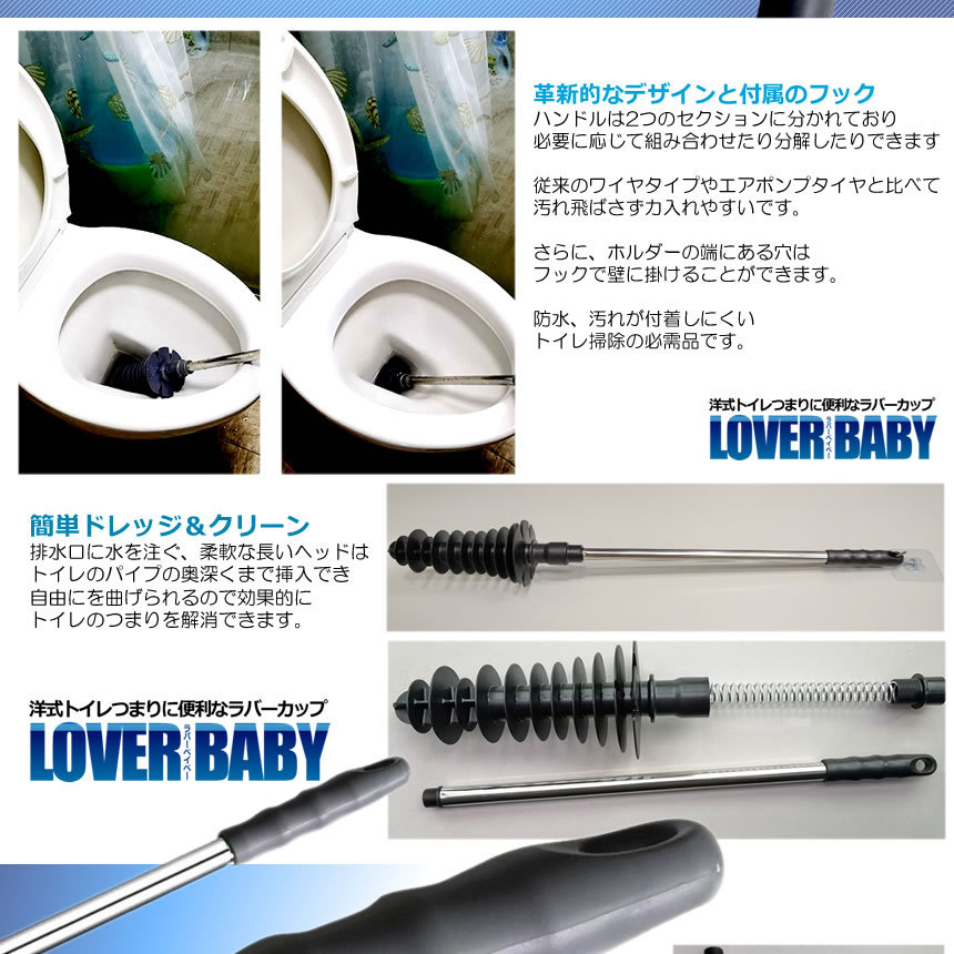 ラバーカップ 洋式トイレに適応 つまり すっぽん パイプクリーナー 台所 トイレ掃除 ステンレスハンドル トイレ詰まり取りツール 粘着フック付き トイレ用ブラシー グレー size 1 pack